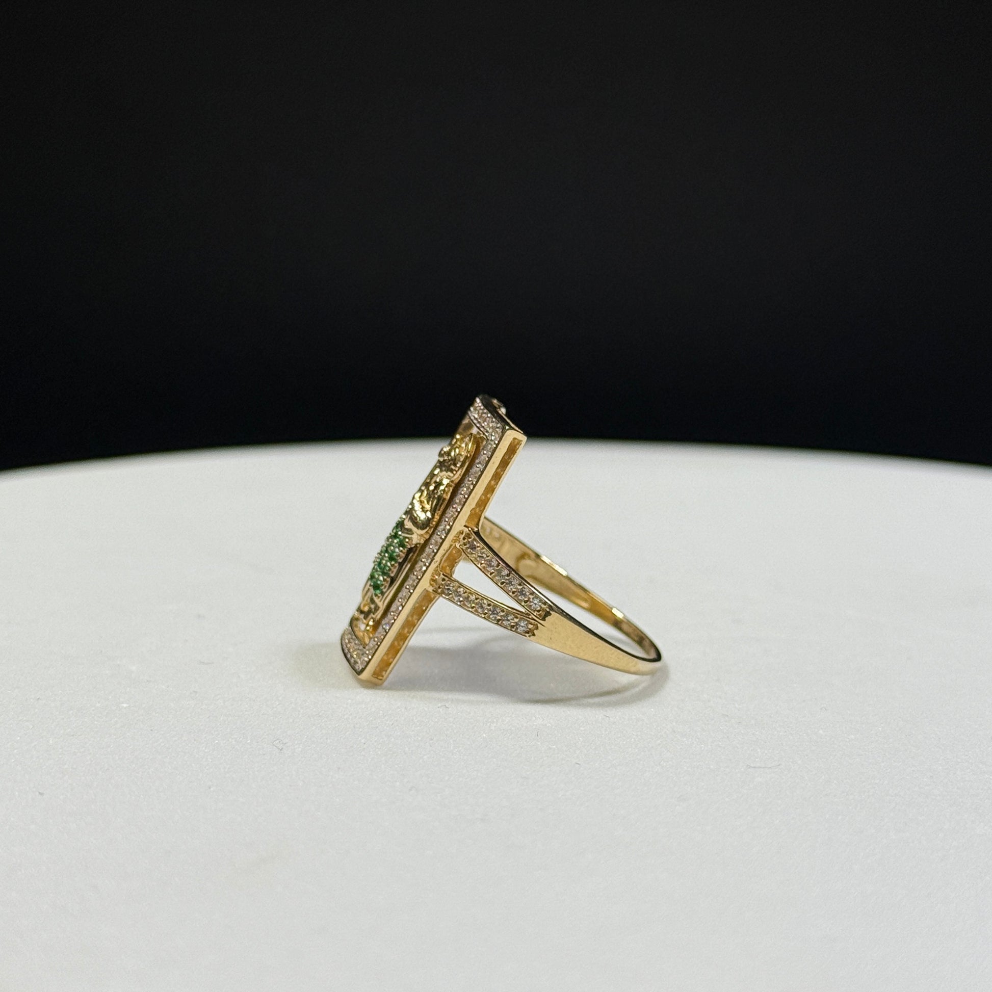 14K yellow gold ring features a beautifully crafted depiction of San Judas Tadeo, accented with vibrant green stones and surrounded by a halo of sparkling cubic zirconia stones. The rectangular face and split shank give it a bold yet refined profile, making it perfect for both devotion and everyday wear.
