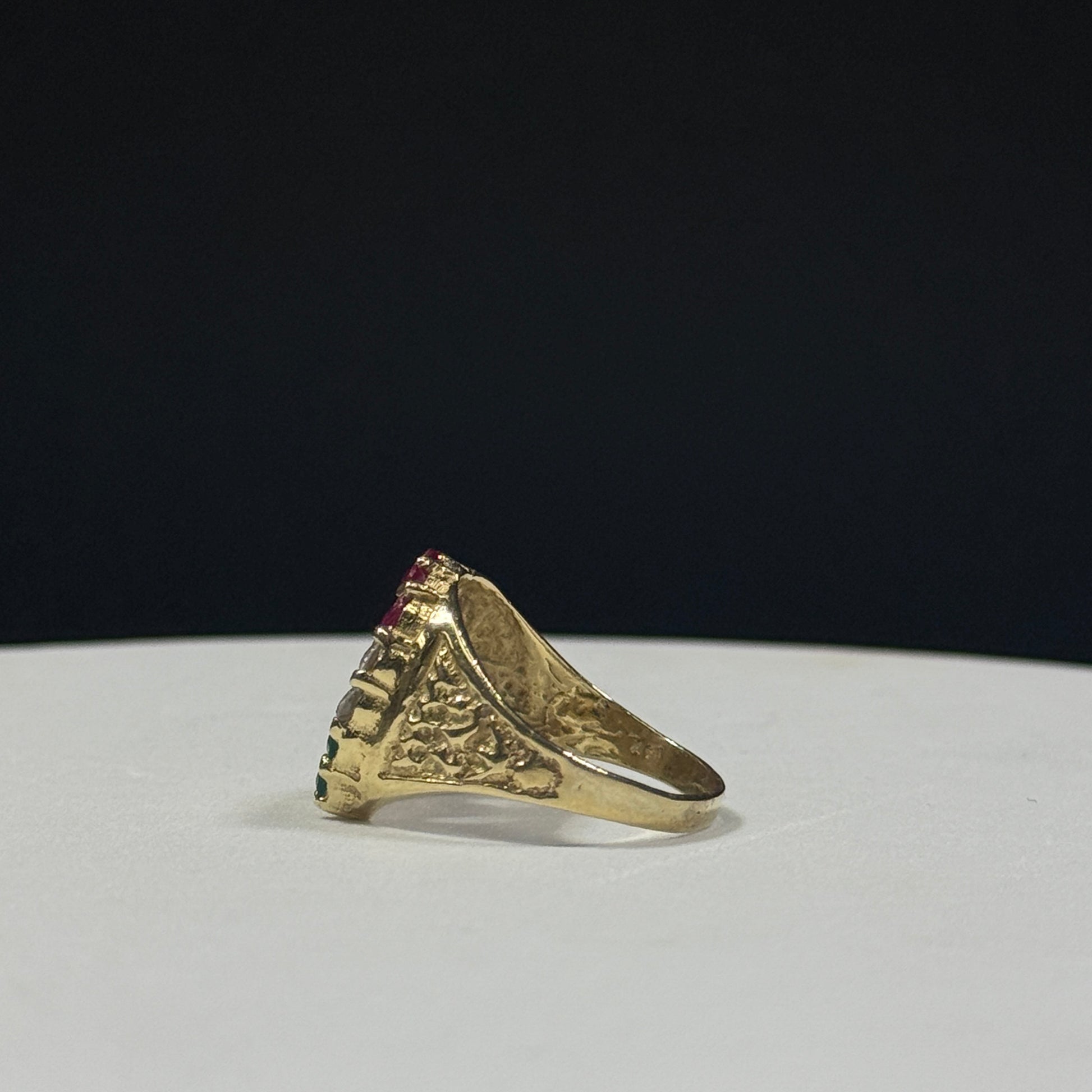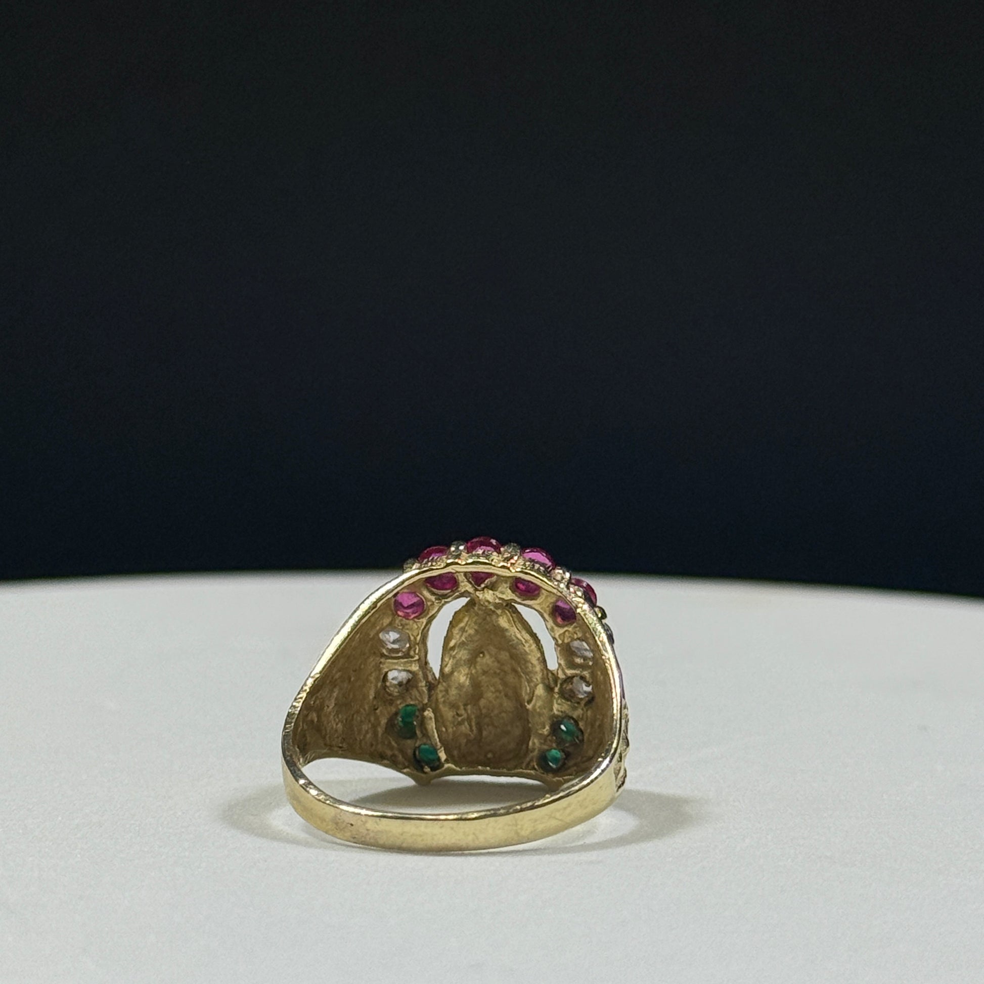 A powerful statement of faith and style, this 14K yellow gold ring features a detailed depiction of the Virgin Mary framed by a horseshoe design. The vibrant gemstone accents — red, white, and green.