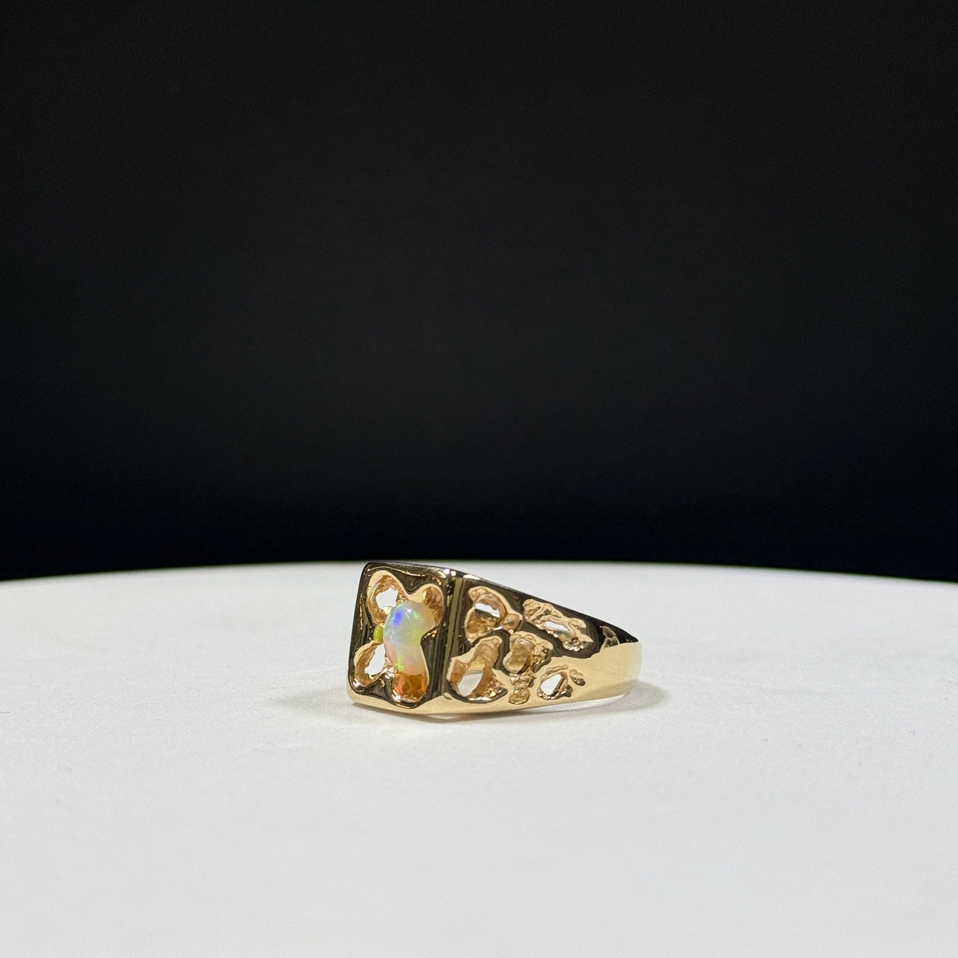 14K yellow gold nugget ring showcases a stunning round-cut opal at its center, radiating flashes of green, orange, and blue fire. The textured gold nugget design on the sides adds a rugged, vintage charm that perfectly complements the opal’s ethereal glow.